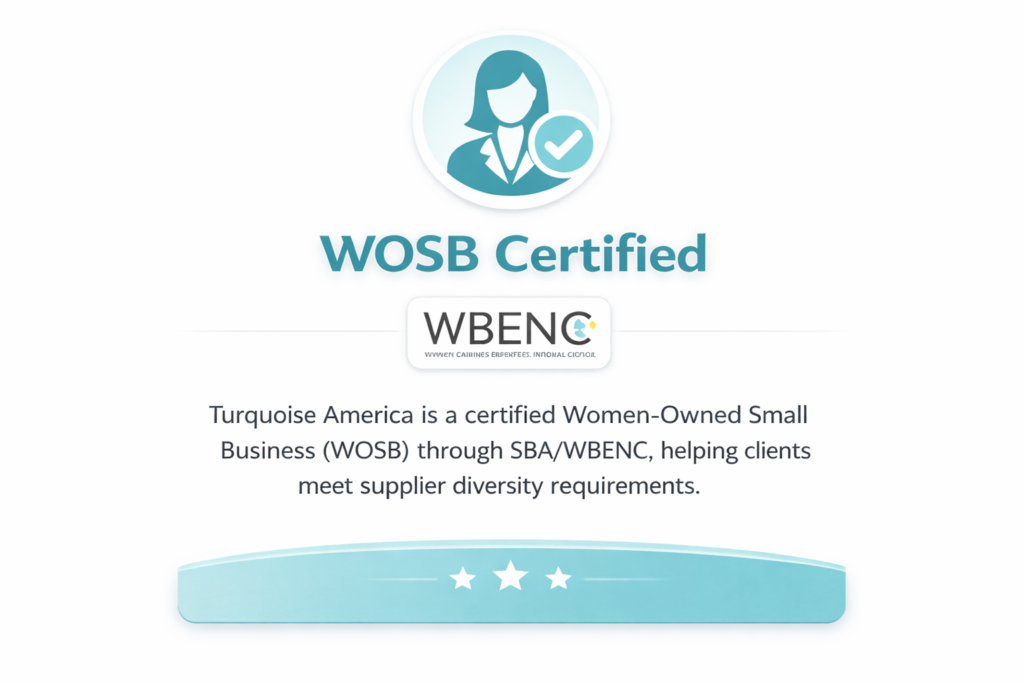 Turquoise America is a certified Women-Owned Small Business (WOSB) through SBA/WBENC, helping clients meet supplier diversity requirements.